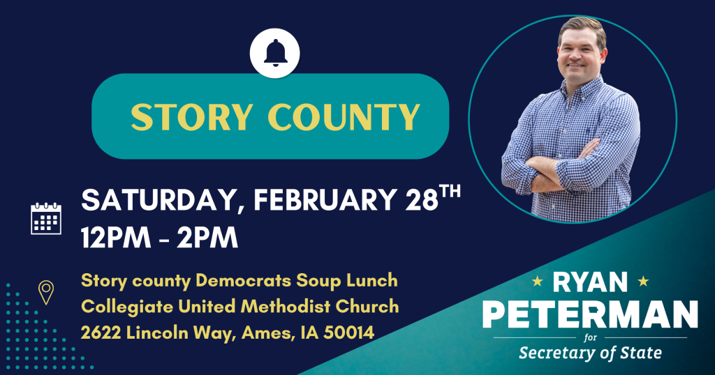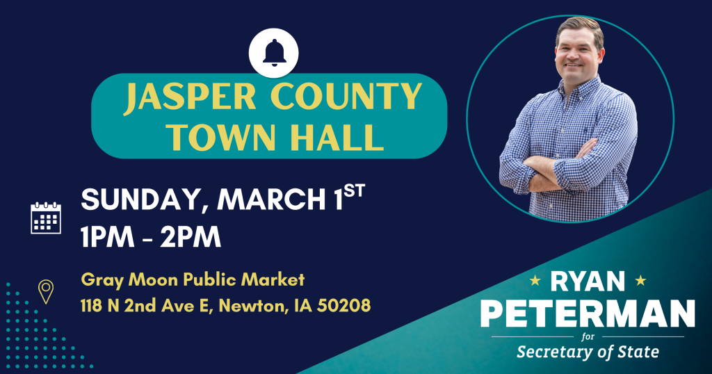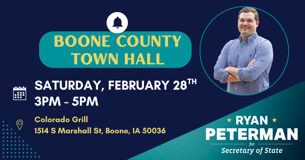 Ryan Peterman served as a Naval Aviator, a Senate Defense Fellow, and a mentor at the U.S. Naval Academy. Now he’s home in Iowa, running for Secretary of State to protect our elections with integrity and steadiness. Chip in to help Ryan serve again—this time, for all Iowans.